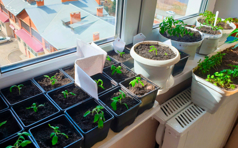 Помидоры менее требовательны к свету, поэтому сеять их можно во второй половине декабря, чтобы в начале марта снять первые плоды. Посев лучше произвести в небольшие стаканчики (вполне подойдут одноразовые, прозрачные, что позволит следить за развитием растений). Семена – не более двух семечек в один стаканчик – необходимо заглубить максимум на 1,5 см. После – накрыть ёмкости плёнкой и поместить в температуру 22-24 °C. Обязательно поливайте посевы, но умеренно.