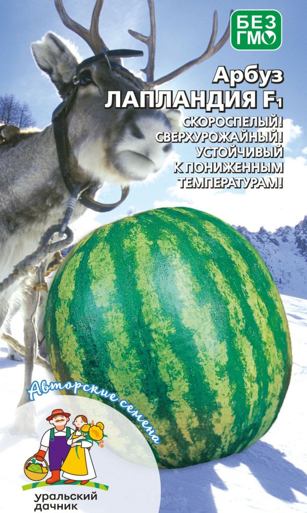 Гибрид получен в результате скрещивания дикого с культурным арбузом и получился необычайно скороспелым, 58-60 дней, в открытом грунте созреет даже в Новосибирске. Высокопродуктивный. Плоды порционные не более 3 кг, на растении образуется 3-5 плодов. Плод округло-овальный, с...