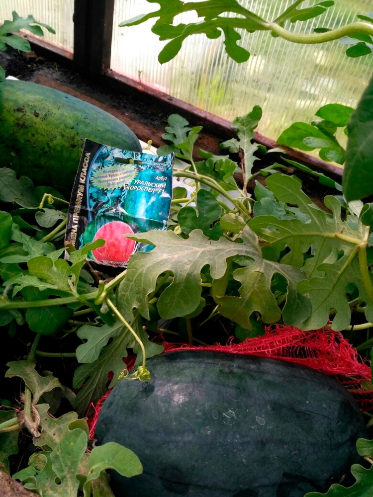 Гибрид невероятно раннего срока созревания, от всходов до первых плодов всего 39-45 дней. Образует крайне интересные мини-плоды: от овальной до слегка удлинённой формы. Средняя масса около 1-1,2 кг, но некоторые ягоды достигают 2-х и более кг. Окраска слегка полосатая, у некоторых плодов более темная. Кора очень тонкая. Мякоть рубиново-красная, очень сочная, необычайно приятно хрустящая, искрящаяся сахарными зёрнами и очень сладкая. Мини плоды чрезвычайно удобны в транспортировке, и всегда свежую, освежающую ягоду можно скушать за один раз целиком!