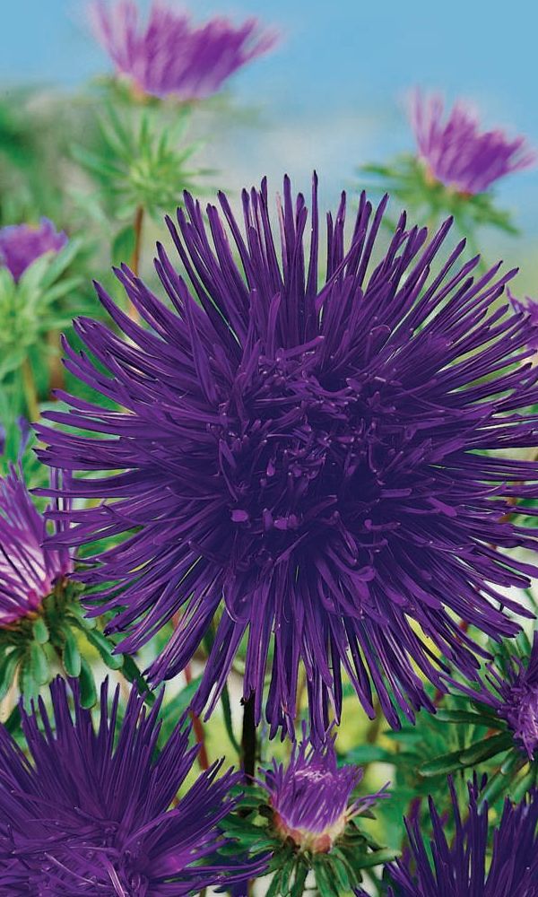 ОднолетнееНовейший сорт с невероятным размером и насыщенным цветом соцветий. Куст высотой 60-70 см. Соцветия полусферические, лучевые, махровые, диаметром до 16 см, фиолетовые. На растении формируется 15 соцветий. Цветение обильное и продолжительное, с конца июля и до заморозков. Используется для посадки в сборные цветники группами и для срезки.