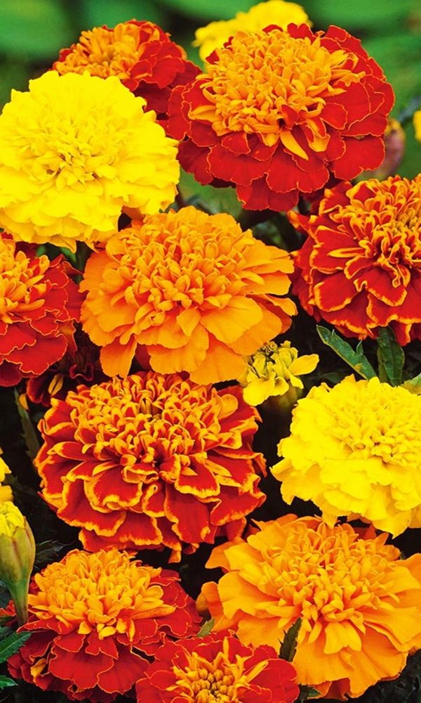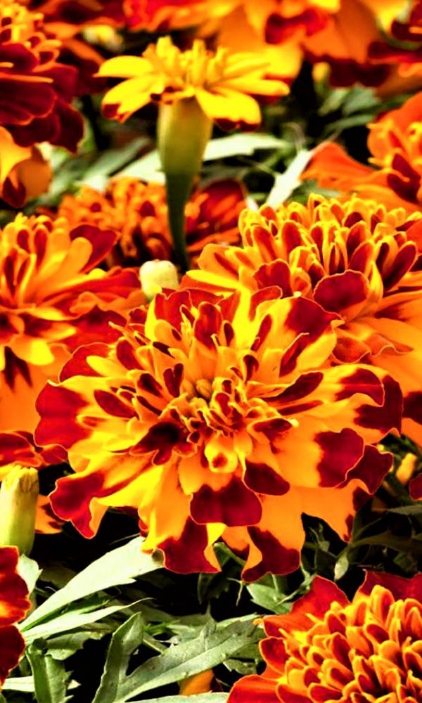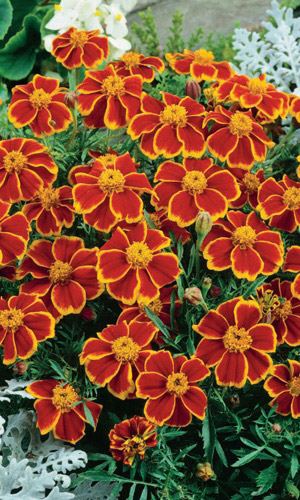 Бархатные соцветия изумительной красоты. Куст компактный, густо-облиственный, в период цветения весь покрывается яркими, двуцветными, оранжево-красными, с золотистыми краями цветками, собранными в махровые соцветия. Используют для клумб, рабаток, бордюров и украшения...