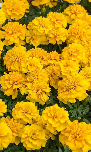 Роскошные, мощные кусты с многочисленными, густомахровыми соцветиями нежного, золотисто-жёлтого цвета, хризантемовидной формы. Бархатцы гармонично выглядят в любых цветниках, прекрасно держат форму (не разваливаются от дождя и ветра), переносят понижение температуры...