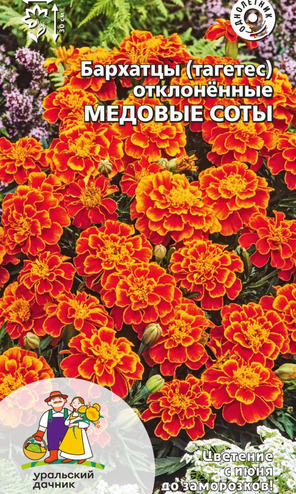 Низкорослые, компактные, обильно цветущие бархатцы, с крупными, махровыми соцветиями сочного, ярко-оранжевого оттенка, великолепно украсят любую цветочную композицию. Кустики выровненные, не вытягиваются, остаются плотными и компактными на весь период цветения...