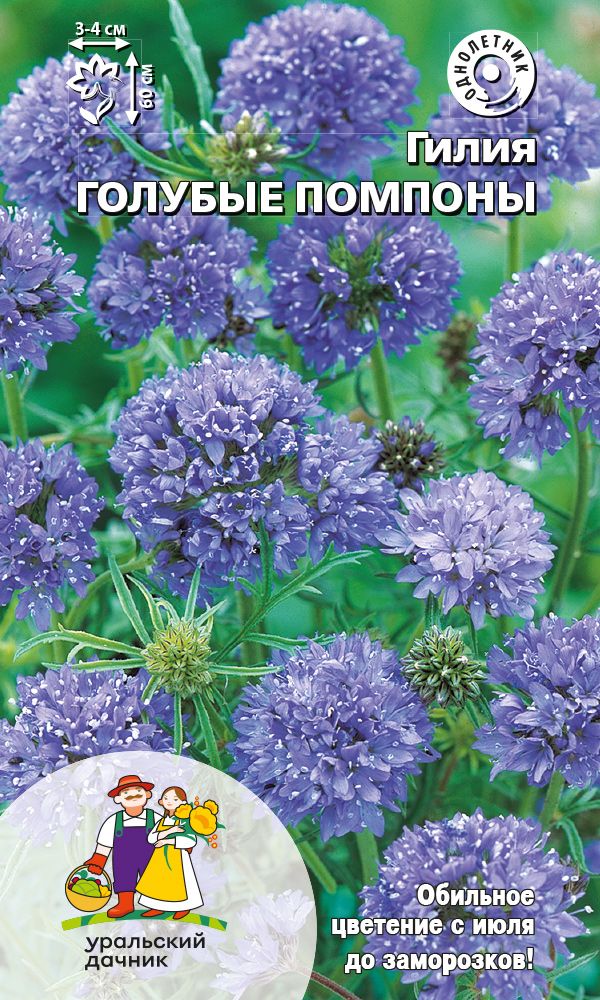 МноголетнееИзящное красивоцветущее многолетнее растение, выращиваемое как однолетнее. Гилия вполне может размножаться самосевом. Если вы оставите соцветия на семена, то какая-то часть их непременно перезимует и весной взойдет. Родом из Северной Америки, семейство Синюховые. Особую декоративность придают красиво изрезанные изумрудно-зелёные листья и сочно-голубые помпоны соцветий. Побеги высотой до 60 см увенчаны многочисленными густыми очаровательными соцветиями тёмно-голубого цвета, каждое соцветие может состоять из ста и более цветов. Растение светолюбивое, холодостойкое, переносит заморозки. Неприхотливо к условиям выращивания. Цветёт обильно и продолжительно. Превосходно подходит для украшения альпийских садиков, цветников, рабаток, для оформления вазонов и балконных ящиков.