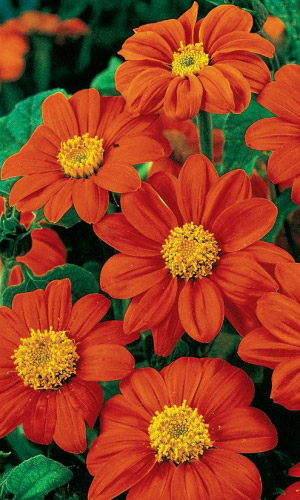 Роскошные высокие кусты высотой 100 см. Родина титонии – Мексика, её называют еще мексиканским подсолнухом. Стебли красноватые, слабо опушенные. Растение при всей своей мощности не требует подвязки. Соцветия крупные корзинки диаметром 5-8 см, красной окраски, с жёлтой...
