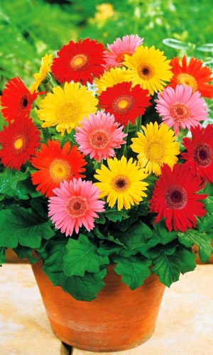 ОднолетнееВеликолепное комнатное растение. Куст компактный, высотой до 50 см. Крупные соцветия – корзинки изумительной окраски с жёлтыми, оранжевыми, красными, розовыми и белыми краевыми цветками вокруг жёлтой серединки. Цветет осенью, сокращение светлого времени суток служит сигналом к цветению.
