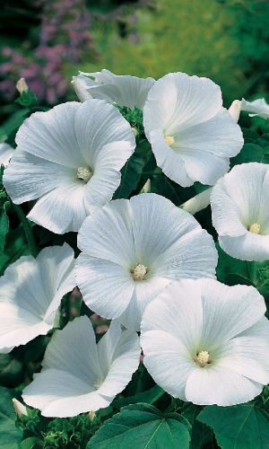 Цветок до 10 смСорт с ослепительно белыми цветами, наслаждаться которыми вы сможете до поздней осени. Крупные, красивые, яркие цветы достигают 10 см в диаметре. Мощные ветвистые растения высотой до 60 см. Обильное цветение с июля до конца сентября. Украсит любое место в саду. Особенно красив в сочетании с тёмно-розовыми и красными сортами. Чередование белого и красного просто восхитительно. Лаватера красива как цветущая изгородь или ширма. Особенно привлекательна в сочетании с дельфиниумом и табаком. Прекрасно стоит в вазе, а срезанные цветы долго сохраняются в воде.