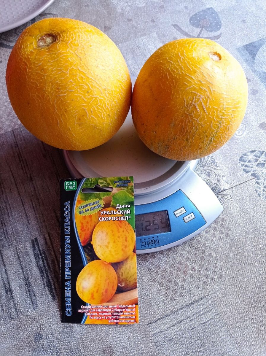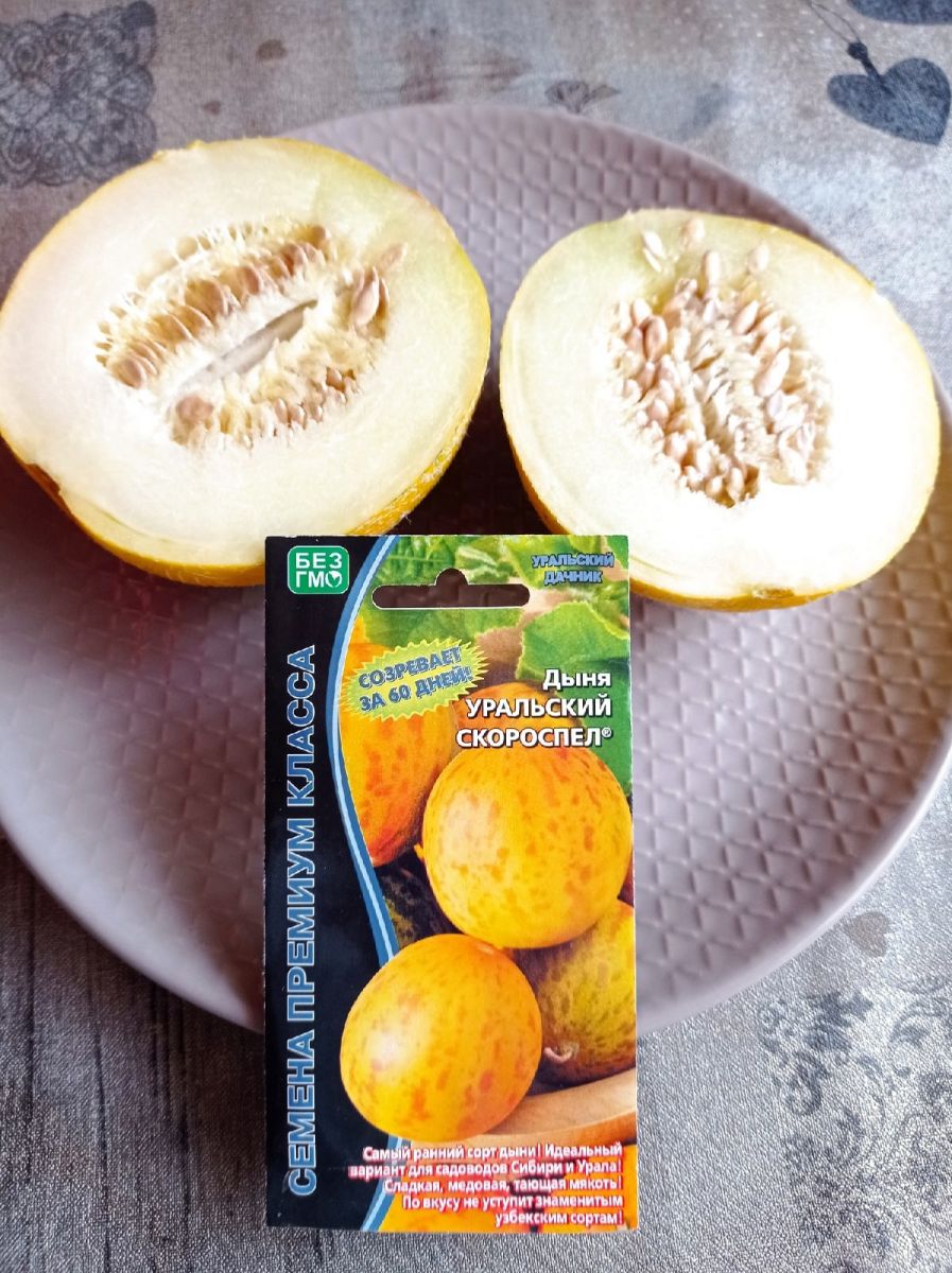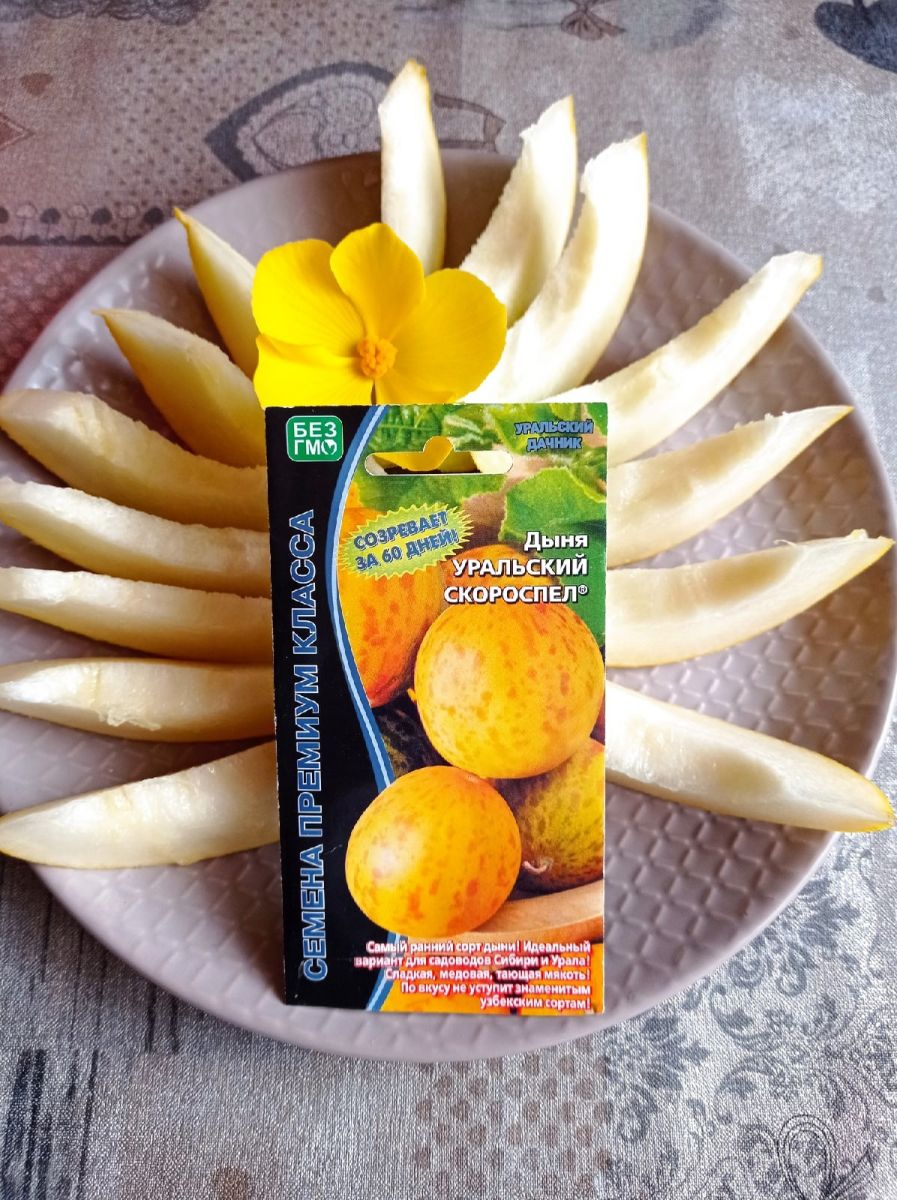 Очень ранний сорт, не имеющий аналогов, как в России, так и в ближнем зарубежье. Срок созревания 50-60 дней. Растение длинноплетистое. Плоды маленькие, массой 250-300 г, округлой формы, преимущественно гладкие, ярко-жёлтого и затем ярко-оранжевого цвета. Мякоть желтоватая, очень насыщенного сладкого вкуса. Это именно то, что давно все ждали: дынька, которую можно съесть за один раз, не оставляя часть плода на потом.