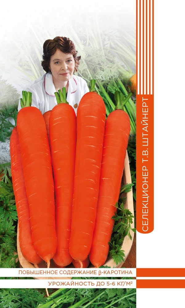 Высокоурожайный, среднеспелый сорт для хранения. Корнеплоды крупные, конусовидные, длиной до 25 см, ярко-оранжевые, с маленькой сердцевиной. Мякоть сочная, нежная, очень сладкая.Ценность сорта: отличная лёжкость, повышенное содержание каротина и сахаров. Рекомендуется для потребления в свежем виде, переработки и хранения...