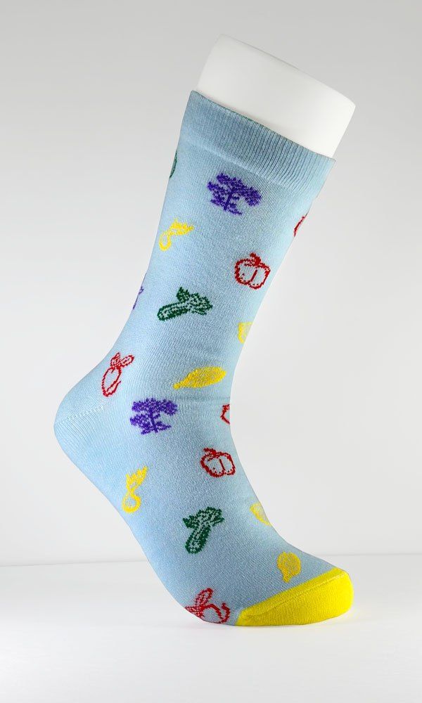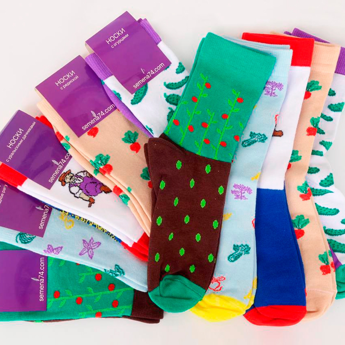 Небесно-голубые носки с жёлтым носком и нашим собственным паттерном культур, входящих в рецепт овощного рагу.Состав: 80 % хлопок, 17 % полиамид, 3 % эластан.Размер L / EU 42-45Производство: Россия.ГОСТ ISO 9001-2015...
