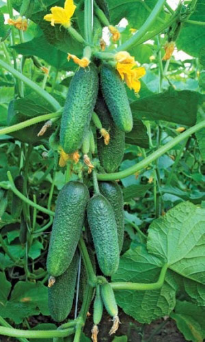 Самоопыляемый! Суперпопулярный пучковый гибрид! Холодостойкий, с длительным плодоношением, до заморозков! Крепкий, обалденно вкусный, хрустящий, без горечи! Создан для засолки! Плоды крупно-бугорчатые, белошипые, длиной 10-12 см, плотные, сладкие. От обилия плодов не видно листьев! Не перерастает, не бывает горьким, не образует пустот при консервировании и засолке...