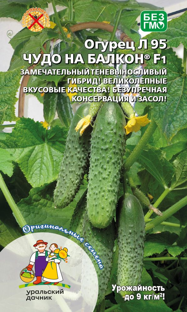 В пакете семена огурца Л95, полученного методами классической селекции и зарегистрированного в Государственном реестре селекционных достижений. Чудо на балкон® зарегистрированный товарный знак.
