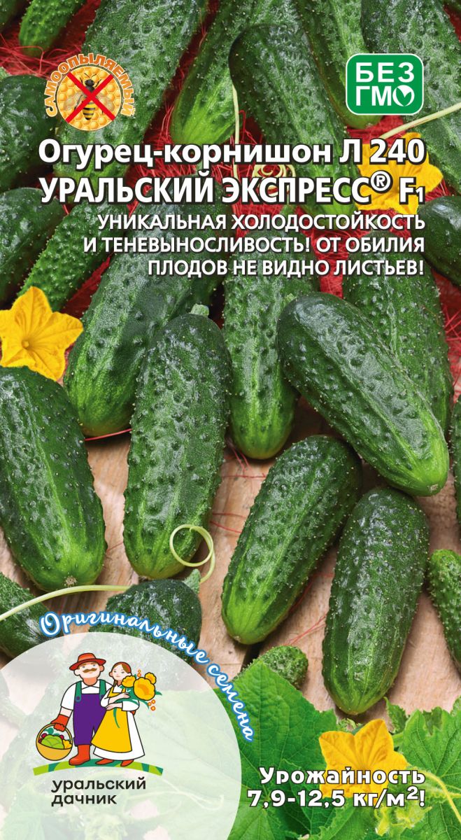 В пакете семена огурца Л240, полученного методами классической селекции и зарегистрированного в Государственном реестре селекционных достижений. Уральский экспресс зарегистрированный товарный знак.