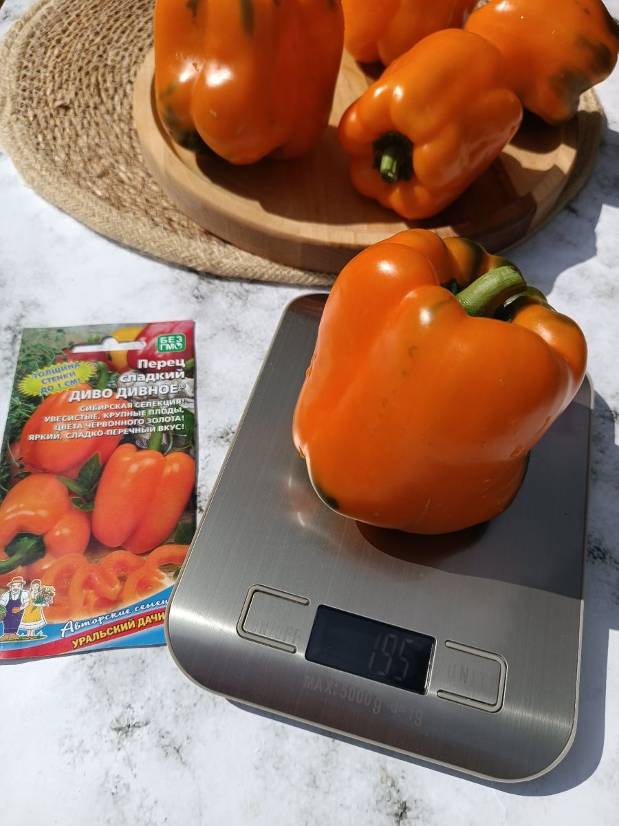 Уникальный раннеспелый сорт, который по общему урожаю превосходит стандарт до 30 %. Куст штамбовый, растение компактное, высотой 60-65 см, среднеоблиственное. Плоды очень крупные, увесистые массой до 200 г, призмовидной формы, в технической спелости тёмно-зелёные, в биологической – оранжевые, толщина стенки стремится к 1 см. Мякоть сочная, сладкая, с ярко выраженным перечно-фруктовым ароматом.