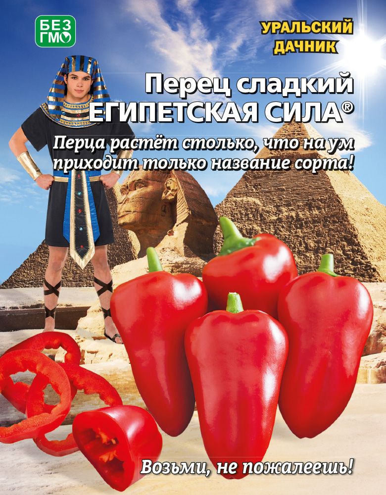 Название сорта складывается из двух составляющих, во-первых, это форма – она правильная треугольная и напоминает пирамиды, плоды некрупные, но увесистые, за счёт толстой и мясистой стенки, толщина которой достигает на некоторых плодах до 1 см, по этому маленькие плоды набирают достаточно приличный вес – 130-150 г!, а во-вторых, это обильность плодоношения, этих сладкущих плодов будет как из рога изобилия, смотришь на количество плодов и на ум приходит только: «Египетская сила, куда же это всё девать», но с этим проблем не возникнет, так как его можно и свежим в салат, и замораживать и лечо делать. Сорт выведен в Сибири, без ГМО, имеет высокое содержание витамина «С» в плодах 198 мг%, чтобы у Вас и ваших родных и любимых было крепкое сибирское здоровье!