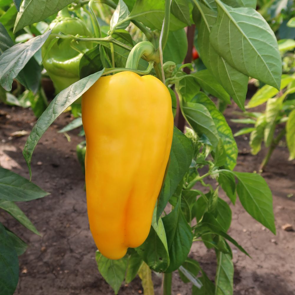 Растение очень мощное, раскидистое, с хорошей завязываемостью плодов, одновременно формирует до 10 однородных плодов, средней массой 240-260 г (18x9 см). Плоды кубовидно-цилиндрической формы, четырехкамерные, толстостенные (7-8 мм), созревают из тёмно-зелёных в золотисто-жёлтые. Гибрид высоких вкусовых достоинств, имеет приятный сладковатый вкус и нежный печеный аромат. По богатству витаминно-минерального комплекса желтый перец превосходит перцы другого цвета.