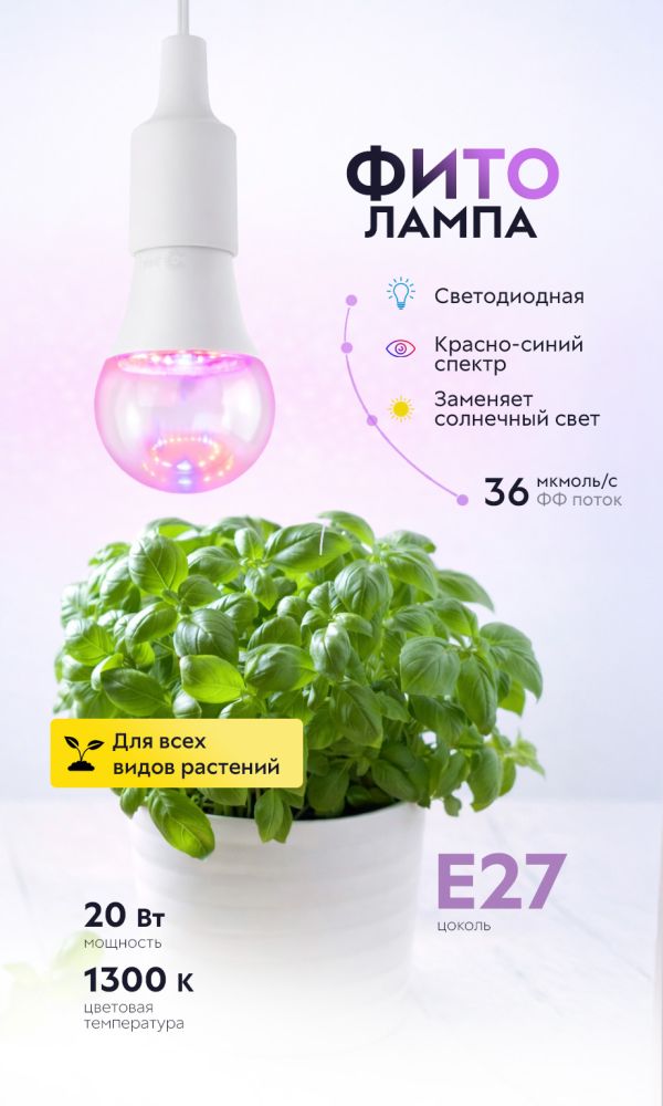 LED фитолампа ЭРА FITO-20W-RB-E27 не нагревается до высоких температур и безопасна для использования в любых светильниках. С длительным сроком службы до 30 000 часов наблюдайте за здоровым ростом своих растений и ярким цветением круглый год!