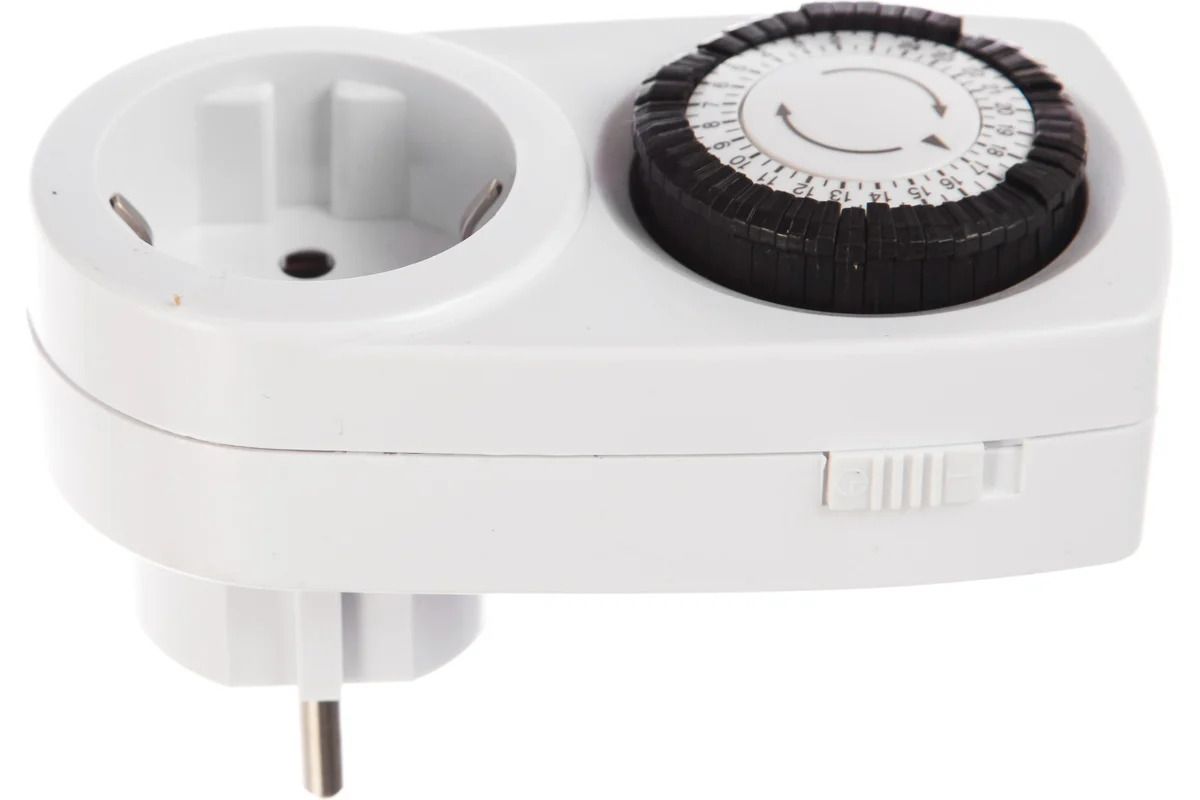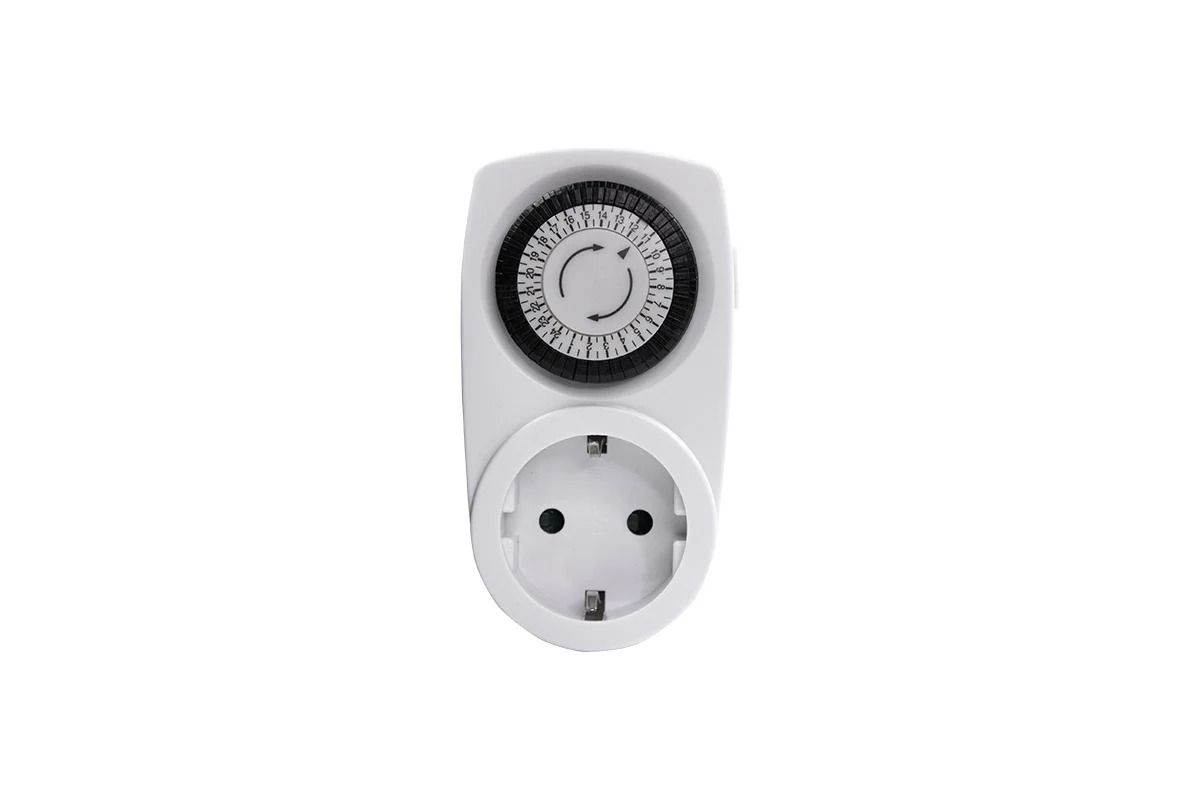 Розетка с таймером даёт возможность автоматически включать и выключать подсветку для растений, а также бытовые электроприборы когда вас нет дома. Работу устройства настраивают с помощью механического диска, шаг - 30 минут.