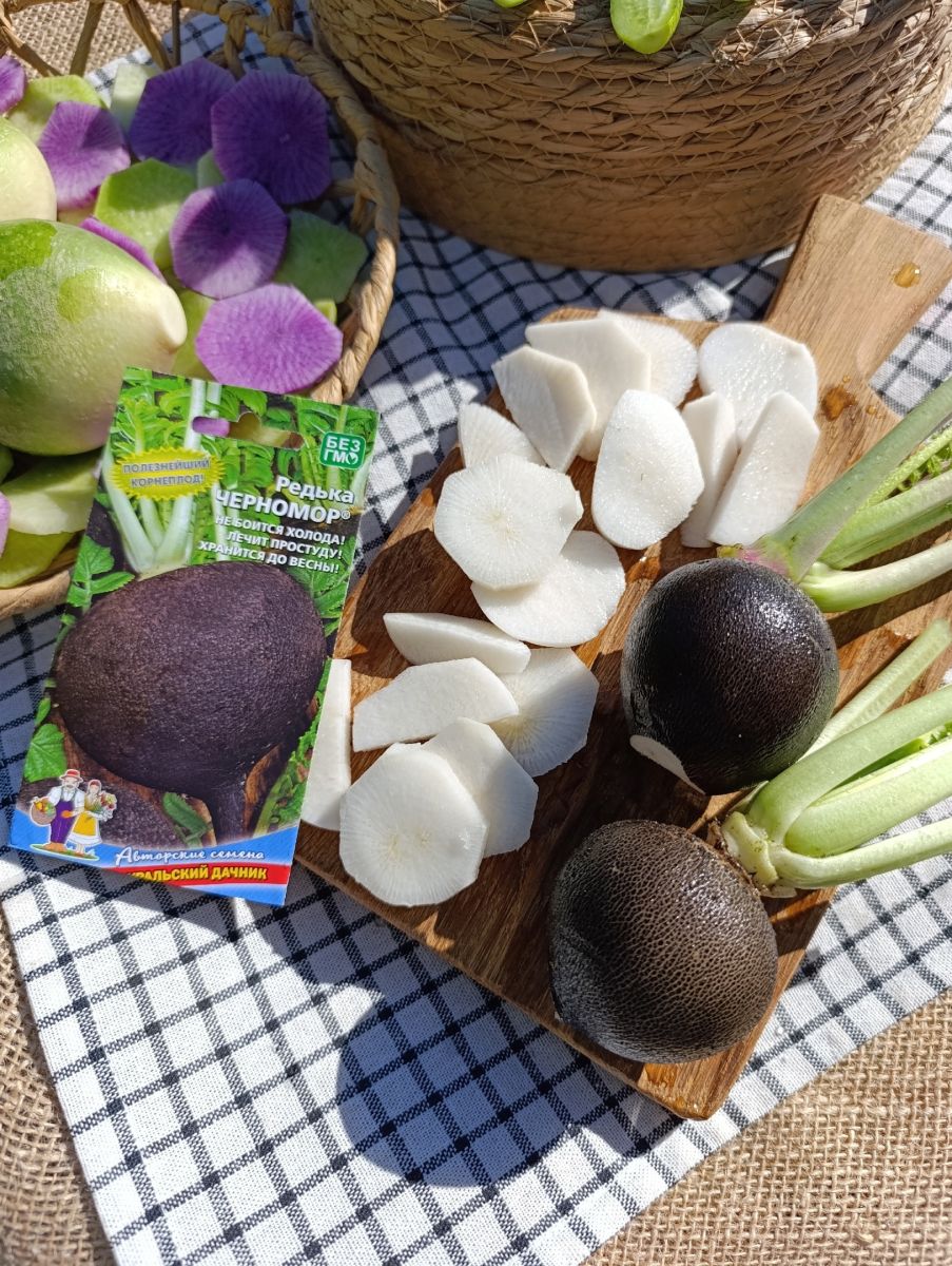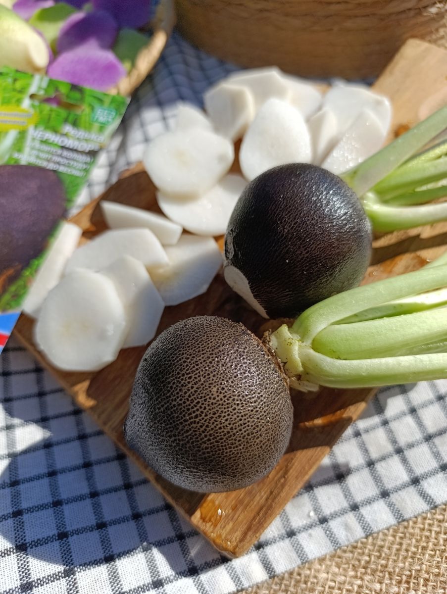 Высокоурожайный, среднеспелый, зимний сорт. Корнеплоды округлые, чёрные, массой 250-300 г, с белой, сочной, вкусной мякотью, слабоострого вкуса.