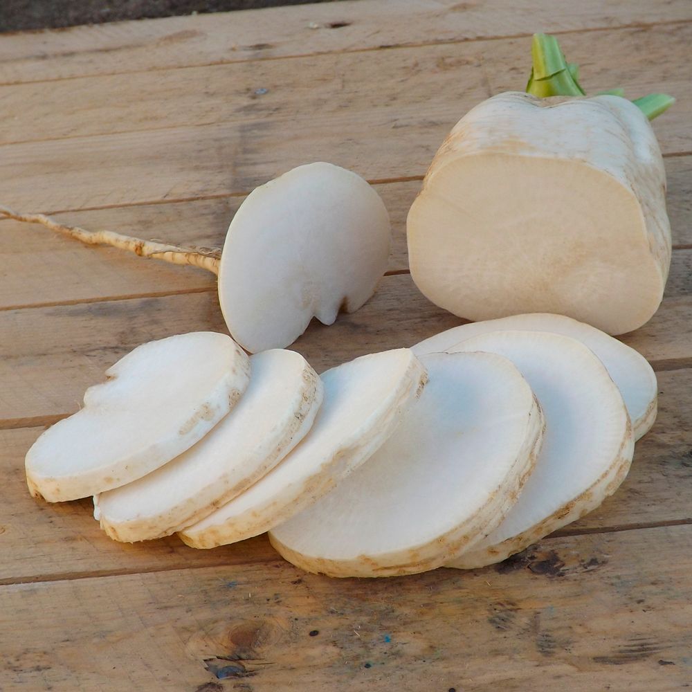 Популярный среднеспелый сорт. Корнеплоды цилиндрические, с утолщением в нижней части, белого цвета, массой 150-250 г. Мякоть белая, сочная, нежная, не деревенеет. Сорт отличает оригинальная форма корнеплода, приятный вкус и высокая выравненность. Рекомендуется для потребления в свежем виде в летний и осенне-зимний период.