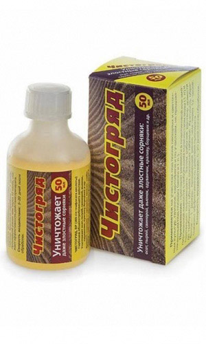 «Чистогряд» – гербицид общеистребляющего действия и десикант.Для уничтожения однолетних и многолетних злаковых и двудольных сорняков, в том числе злостных. Применяется при опрыскивании вегетирующих сорняков до посадки картофеля, овощных и цветочных культур или до посева газонов, при опрыскивании сорняков в послеуборочный период, на межах и т. п. – в период вегетации...