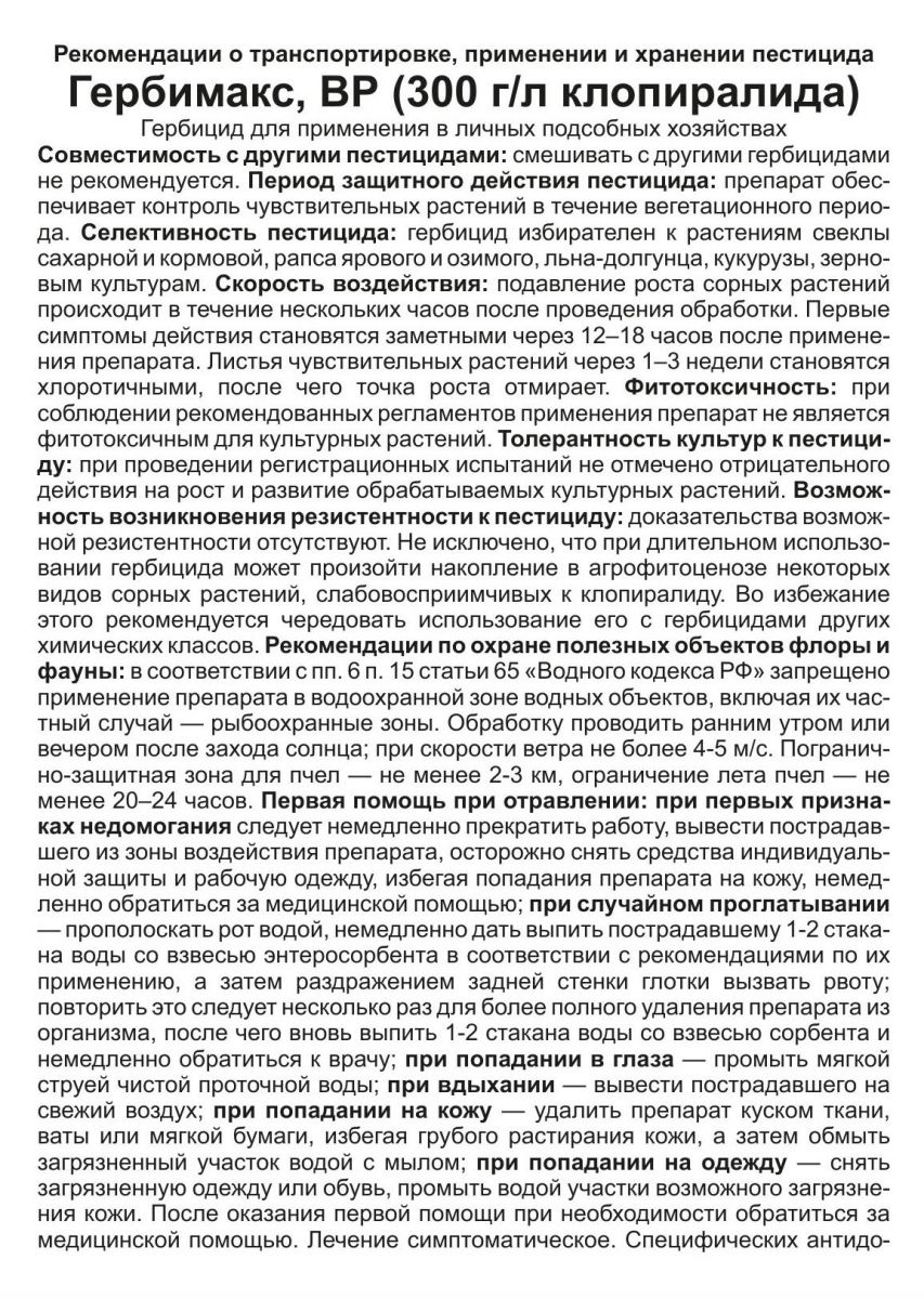 Действующее вещество препарата «Гербимакс» — клопиралид. Это химически синтезированный аналог гормона роста. При обработке газонов действующее вещество проникает через листья и с клеточным соком распространяется по всем тканям растения: не только в надземной части, но и в корневой системе.