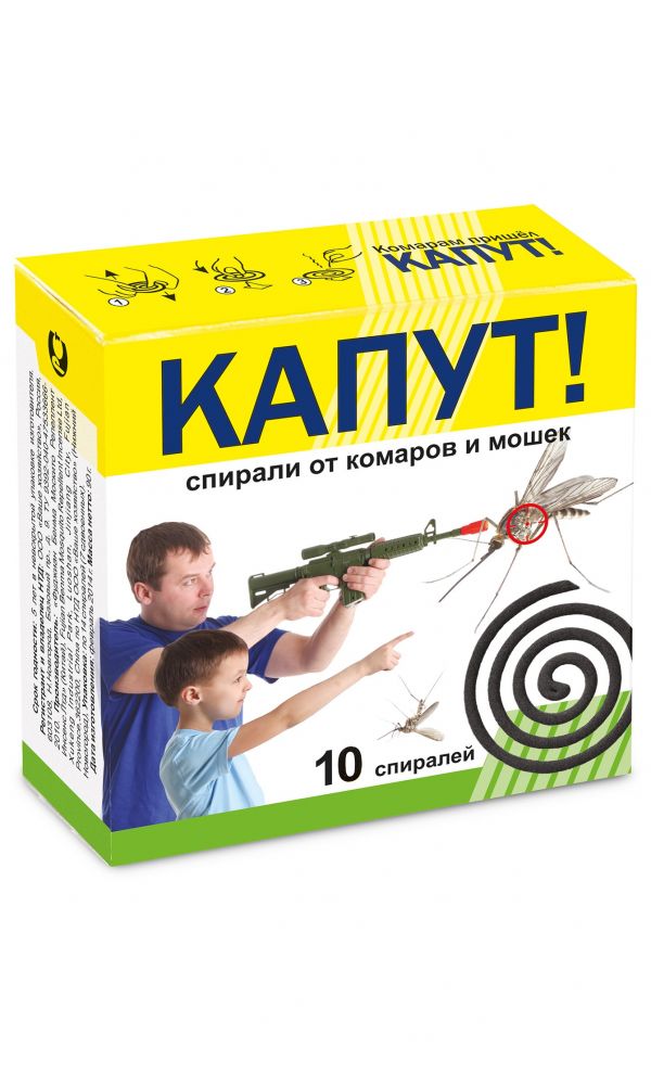 «Капут» — спирали от комаров и мошек. Для уничтожения комаров и других летающих насекомых(мошки, мокрецы, москиты) на открытом воздухе (сад, приусадебный участок, беседка, открытая терраса, веранда) в присутствии людей, а также в закрытых помещениях в отсутствие...