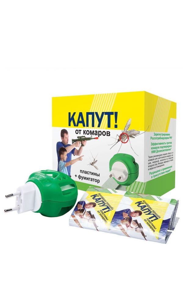 «Капут» — пластины электрофумигирующие, инсектицидные для уничтожения комаров в помещенииПрименение: вскрыть ячейку, достать пластину и установить её в электрофумигатор.Полная гибель комаров в помещениях достигается за 20–40 минут в зависимости от площади. Пластина может быть использована многократно, при условии хранения в упаковке. Одна пластина рассчитана до 10 часов непрерывной работы в помещении 16–20 м².Обесцвечивание пластины показывает окончание срока действия...