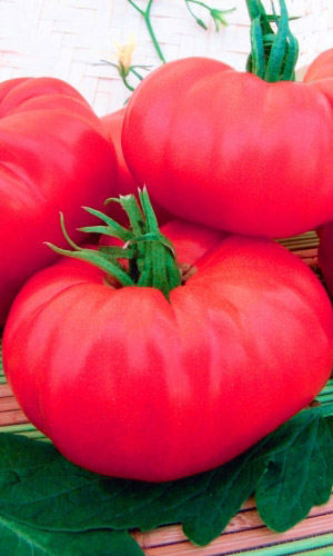 Среднеспелый крупноплодный сорт для плёночных теплиц и открытого грунта. Куст мощный, высотой 100-170 см. Плоды малиново-красные, мясистые, красивой сердцевидной формы, очень крупные, массой 400-700 г, отдельные до 1,2 кг, великолепны в салатах и заготовках на зиму. К достоинствам сорта, кроме того, относятся хорошая завязываемость плодов и достаточно высокая устойчивость к болезням. Сорт выращивают в 2 стебля...