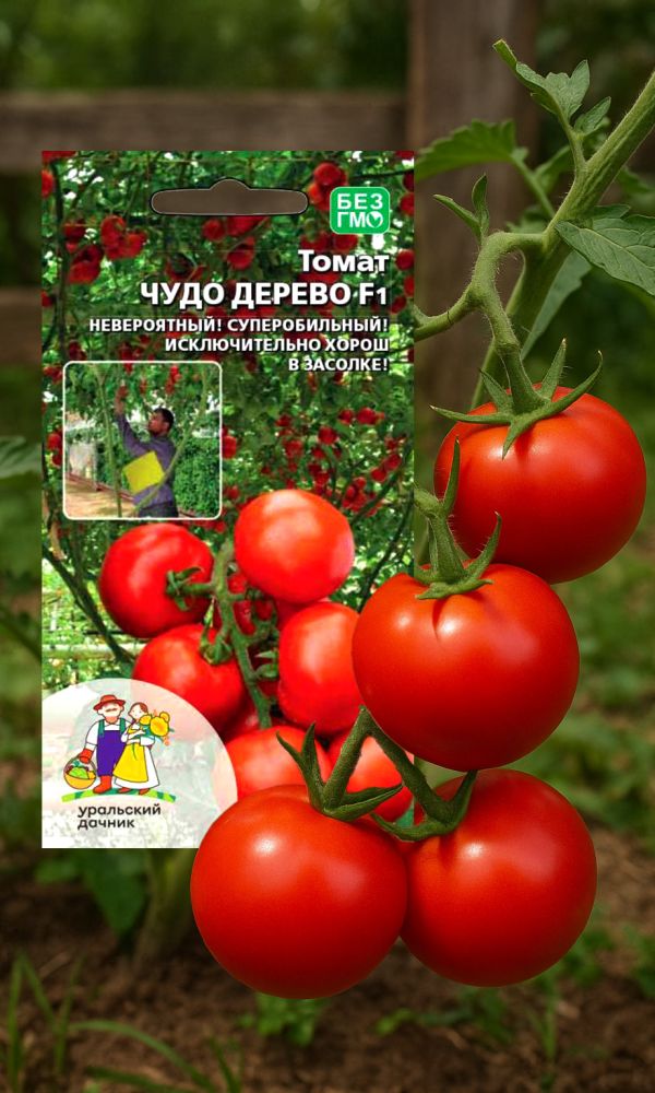 Этот чудо-гибрид относится к кистевым томатам, отличается мощностью и сильным ростом. В теплицах, при интенсивном минеральном питании, в условиях достаточного тепла и света, его можно выращивать, как огромное томатное дерево. Кисти красивые, с 5-6 выровненными плодами в каждой. Плоды округлые, красные, очень плотные, мясистые, массой до 40-60 г.
