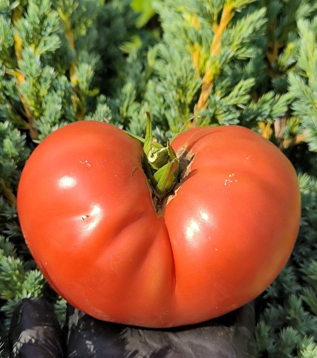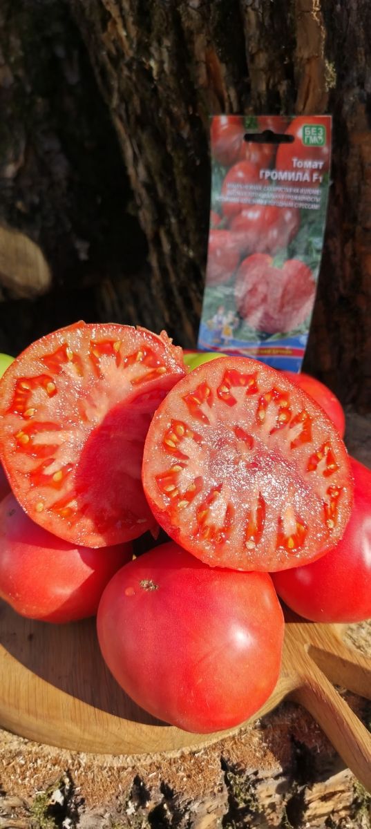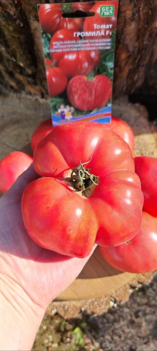 Раннеспелый крупноплодный гибрид для открытого грунта. Достоинством гибрида является крупноплодность в сочетании с низкорослым типом куста, его высота составляет 50-70 см. Плоды густо-розового цвета уплощенно-сердцевидной формы, массой до 500 г. Томаты вкусные, великолепно подходят для салата и зимних заготовок. Возможно выращивание гибрида без пасынкования, но для получения более крупных плодов требуется частичное пасынкование.