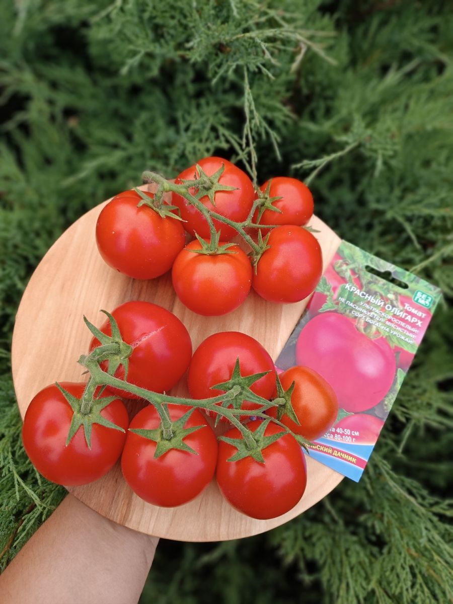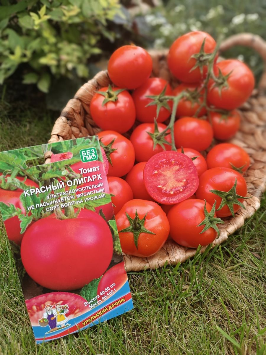 Красный олигарх – богат на урожай! Выдающийся ультраранний сорт Челябинской селекции для открытого грунта. На Урале лето нестабильное: то жара, то холод, поэтому и требования к сорту: холодостойкость, хорошая завязываемость плодов при таких сложных, неблагоприятных погодных условиях. Растения детерминантные, высотой до 50 см, просты в уходе и не требуют пасынкования, прищипки, подвязки. Плоды наивкуснейшие, округлой формы, цвета бордо, массой около 100 г, все равны как на подбор.