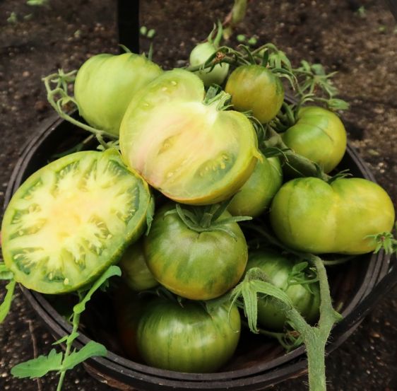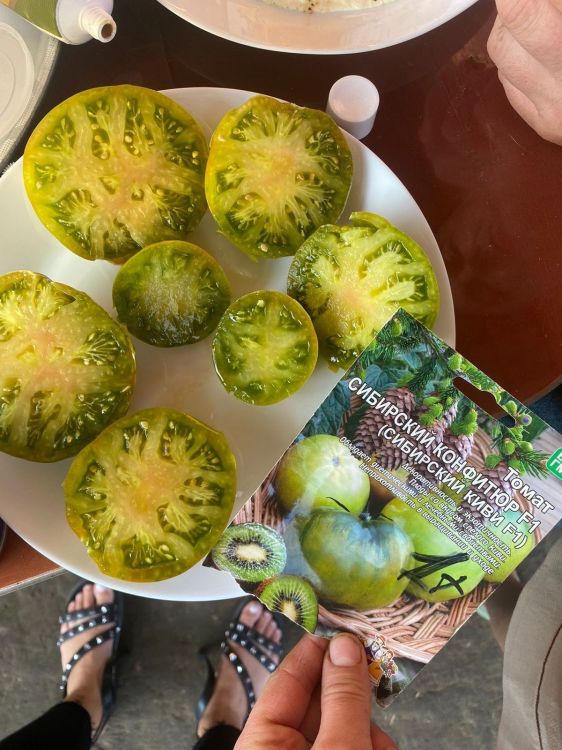 Раннеспелый гибрид для закрытого грунта и плёночных укрытий. Первые необычные по цвету, но созревшие полностью плоды, вы сможете собрать через 90-95 дней после посева семян. Растения индетерминантные, мощные, высотой до 1,5 м. Наилучшую результативность сорт показывает при формировании куста двумя стеблями и размещении не более трёх растений на 1 кв.м. Формирует – изумительно красивые плоды, массой 180-250 г, отличающиеся деликатесным вкусом и высоким содержанием полезных веществ (повышенного содержания сахаров, витамина С и бета-каротина), мясистые, плоскоокруглые, слаборебристые, при созревании зелёные с бронзовым отливом. По вкусовым качествам значительно превосходит многие красноплодные сорта. Мякоть сладкая, очень интересного вкуса, если пробовать его с закрытыми глазами, то по вкусу его можно спутать с плодами спелого киви, да и цвет мякоти остаётся ярко-зелёным, иногда могут иметь алые вкрапления. Урожайность – до 6-8 кг с одного растения. «Сибирские киви» относится к сортам салатного применения, но по многочисленным отзывам от огородников, выращивавших данные томаты, хорошо показал себя при засолке целыми плодами, а так же активно используют в свежих салатах или в качестве самостоятельной нарезки. Благодаря оригинальному внешнему виду и отменному вкусу они становятся украшением любого стола.