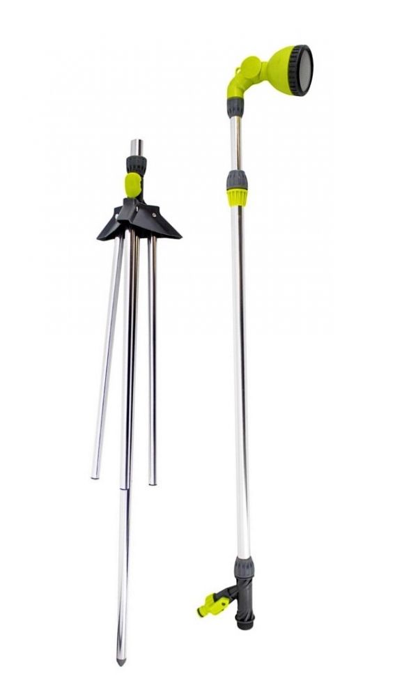 Прост и удобен в эксплуатации. Душ оснащён регулируемой поворотной насадкой-распылителем, регулятором тока воды. Тренога обеспечивает устойчивость конструкции как на ровной поверхности, так и в грунте. Телескопическая металлическая стойка регулируется по высоте от 165 до 220 см. Материал: алюминий, пластик повышенной прочности.