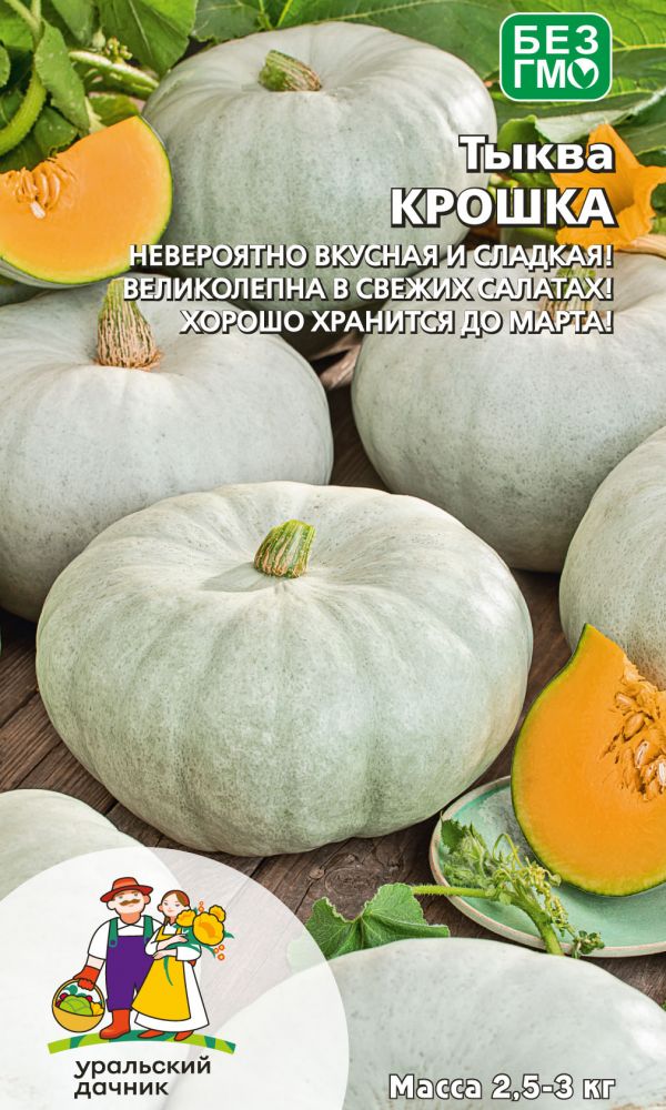 В смесь входят сорта Крошка, Россиянка и Конфетка, это ранние, среднеспелые и среднепоздние сорта, от всходов до уборки урожая 90-128 дней. Плоды плоскоокруглые и чалмовидные, гладкие и сегментированные, светло-серого и ярко-оранжевого цветов, массой 1,5-3,0 кг. Мякоть...