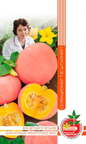 Очень урожайный, среднеранний сорт. Плоды округло-сплюснутой формы, массой 5-6 кг. Кора серая, с розовыми пятнами. Мякоть ярко-оранжевая, плотная, сладкая.Ценность: высокая урожайность, транспортабельность, хорошая лёжкость, устойчивость к мучнистой росе. Самая вкусная из крупноплодных тыкв, с рекордным содержанием сахаров и каротина, которого в плодах этого сорта больше, чем в моркови...