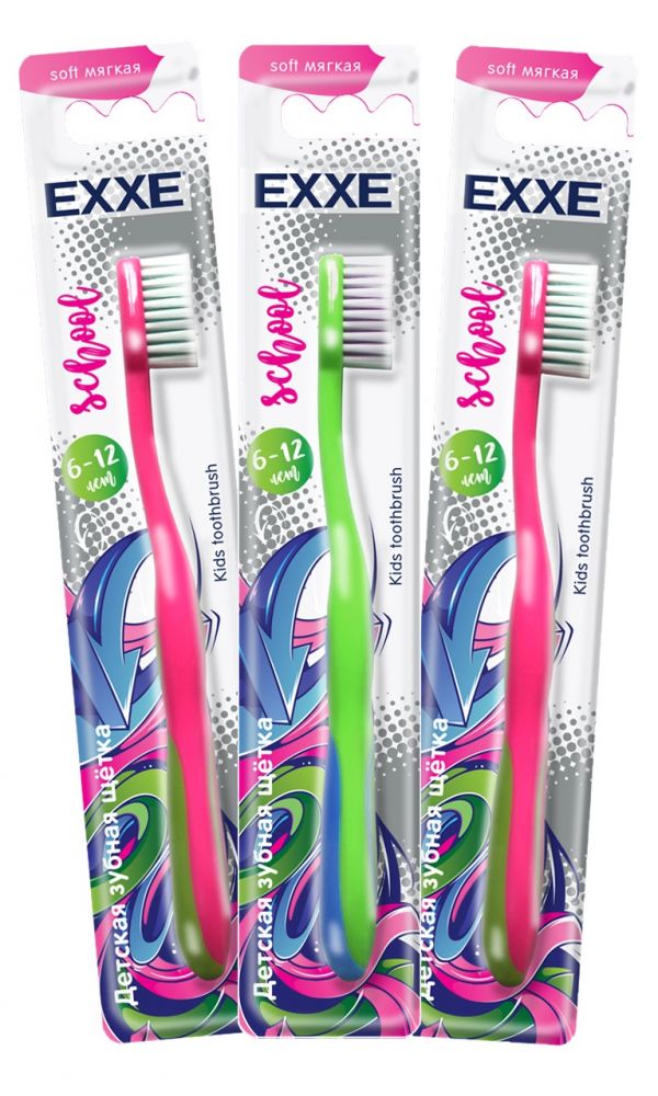 Зубная щётка мягкая для детей EXXE School. Особые мягкие и ультратонкие щетинки деликатно и бережно воздействуют на зубную эмаль, не травмируя поверхность зубов. Удобный изгиб ручки позволяет легко и без дополнительного давления на дёсны очистить дальние поверхности...