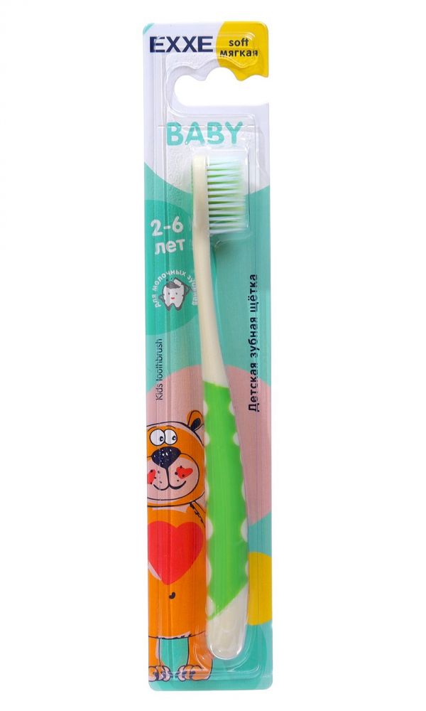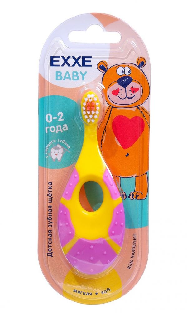 Зубная щётка мягкая EXXE baby для детей от 0 до 2 лет. Мягкие щетинки деликатно и бережно воздействуют на зубную эмаль и дёсны, не допуская их повреждения. Небольшая головка щетки удобна для чистки первых молочных зубов, и соблюдения гигиены полости рта. Щётка создана как для...