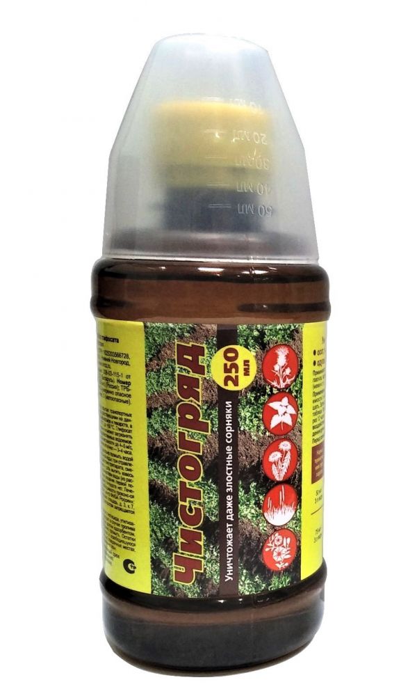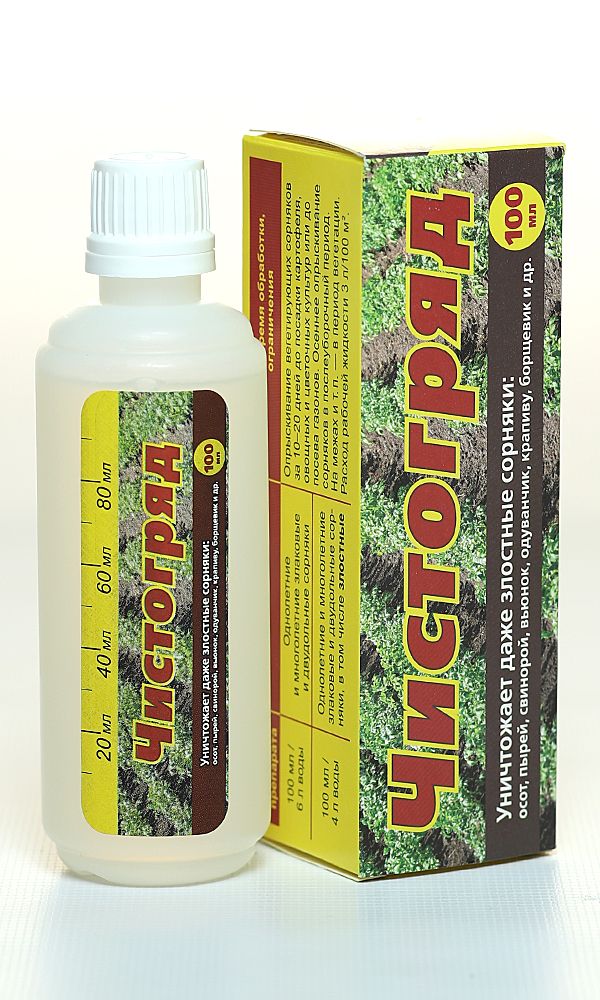 «Чистогряд» – гербицид общеистребляющего действия и десикант.Для уничтожения однолетних и многолетних злаковых и двудольных сорняков, в том числе злостных. Применяется при опрыскивании вегетирующих сорняков до посадки картофеля, овощных и цветочных культур или до посева газонов, при опрыскивании сорняков в послеуборочный период, на межах и т. п. – в период вегетации...